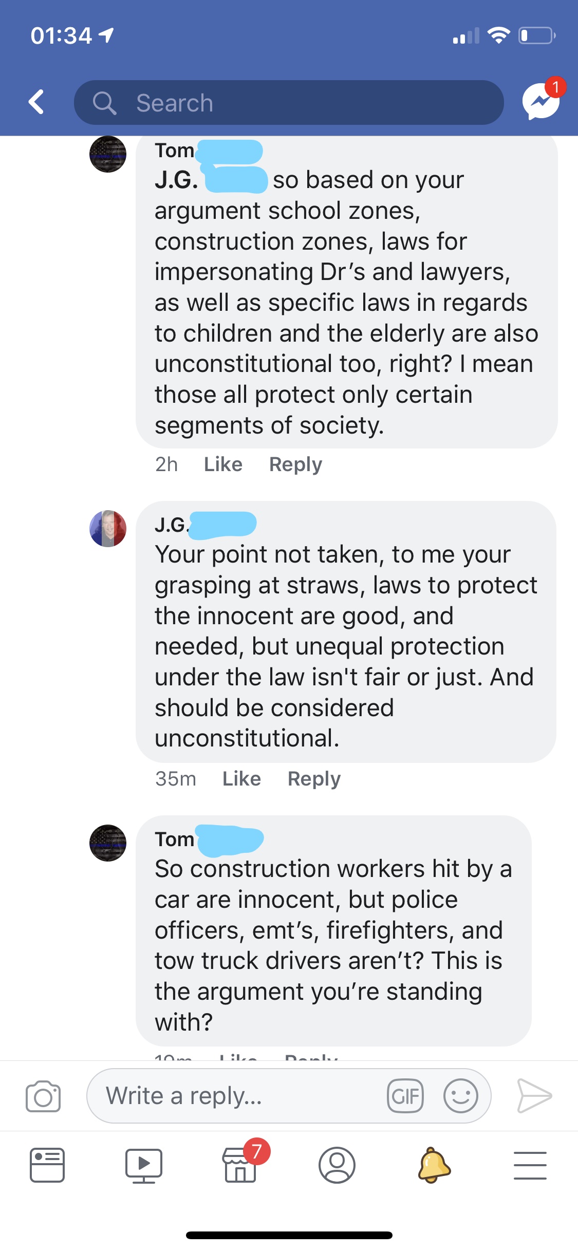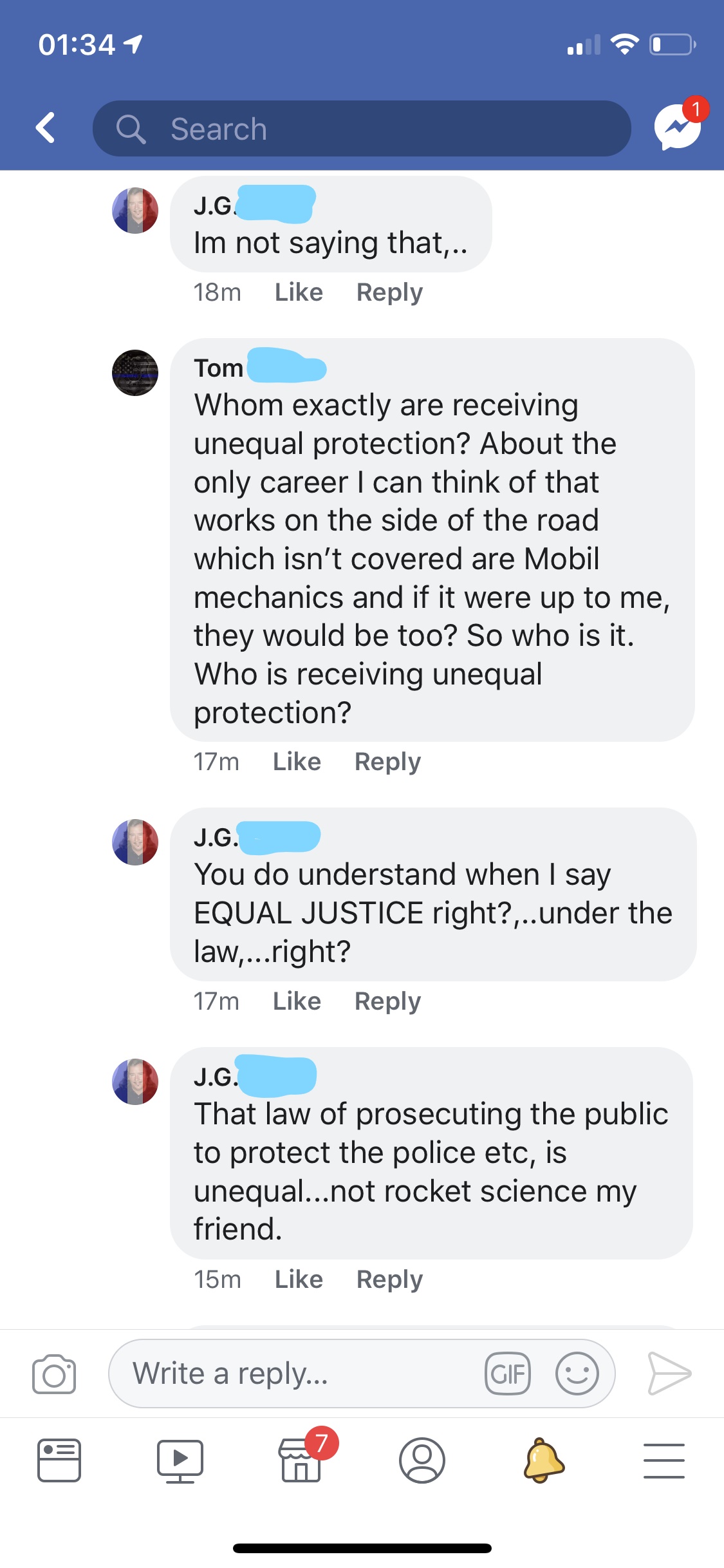 J.G.’s basic contention is this law is unconstitutional because in his opinion, it only protects police officers. Therefore, it is “unequal protection”. So in good form, I interject. My posts are from “Tom”.