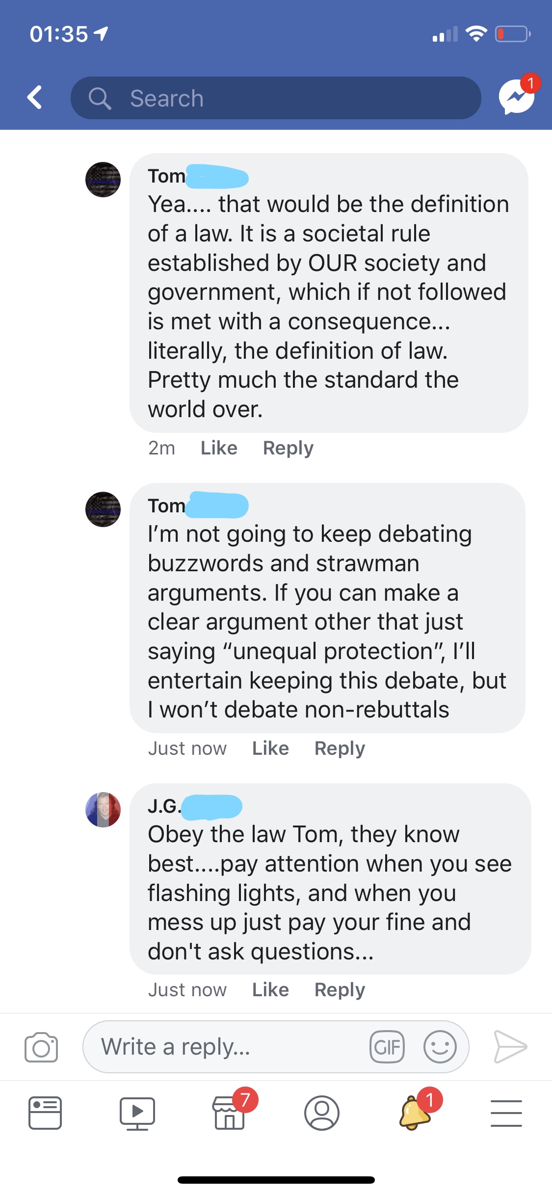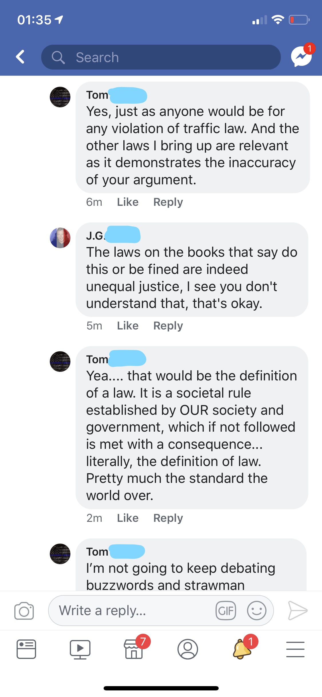 Most of these posts are me trying to get him to identify who exactly isn’t getting equal justice. As you can tell, it’s like trying to nail jello to a wall. J.G. then informs me this post is about a women getting fined for not obeying the laws…… And my counter: